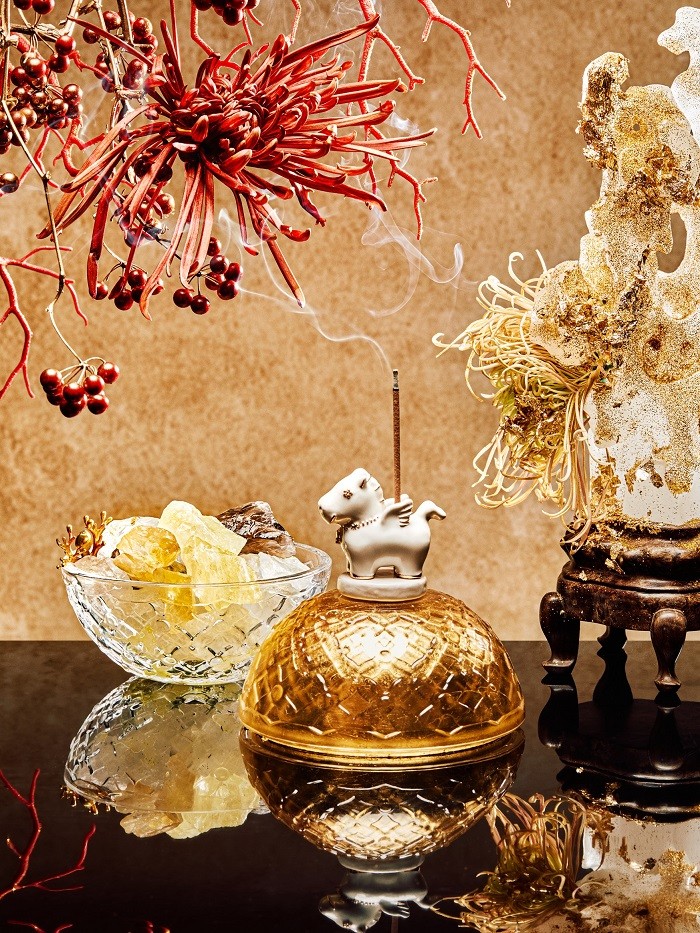 而在更具陈设与收藏意味的年礼选择上,“飞马运宝”晶石香氛罐同样延续「醉马观花」香意,以描金小飞马造型为核心,昂首立于铜钱纹玻璃罩之上,寓意纳财聚福、行运在握。该系列以“晶石藏香”为旨,带来两款不同呈现:其一于罐中点缀晶石珠链,飞马身姿更显灵动;其二以金箔工艺铺陈玻璃罩,金意更盛、光泽更足,为年礼添一份沉稳华彩;该款小飞马亦可作线香香座,让焚香与散香同器相映。两款皆以“运宝入门、福泽绵延”的视觉意象,回应新岁对丰盛与安稳的期盼。