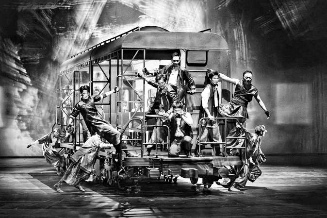 大幕拉开,极度困苦的百姓在铁道上冒死争抢日军物资,枪声响起,鲜血四溅。日寇的铁蹄无情践踏,乡亲们扭曲的躯体凝成无声却痛苦的呐喊。人群中,抗争的身影开始屹立,李正、刘洪、王强等为首的铁道游击队依靠群众的深厚根基,以微山湖为根据地,在列车飞驰的铁道上与侵略者展开生死较量。紧张的音乐节奏、精细的舞台调度交织出强烈的悬念和动感,在“夜袭洋行”一段,可旋转的箱盒般日式建筑立在舞台中心,舞者绕行周围,配合光影的精细变幻,呈现出宛若环拍镜头的视觉效果;“智打票车”舞段中,车厢实景不动,快速流过的多媒体影像却让列车“风驰电掣”。