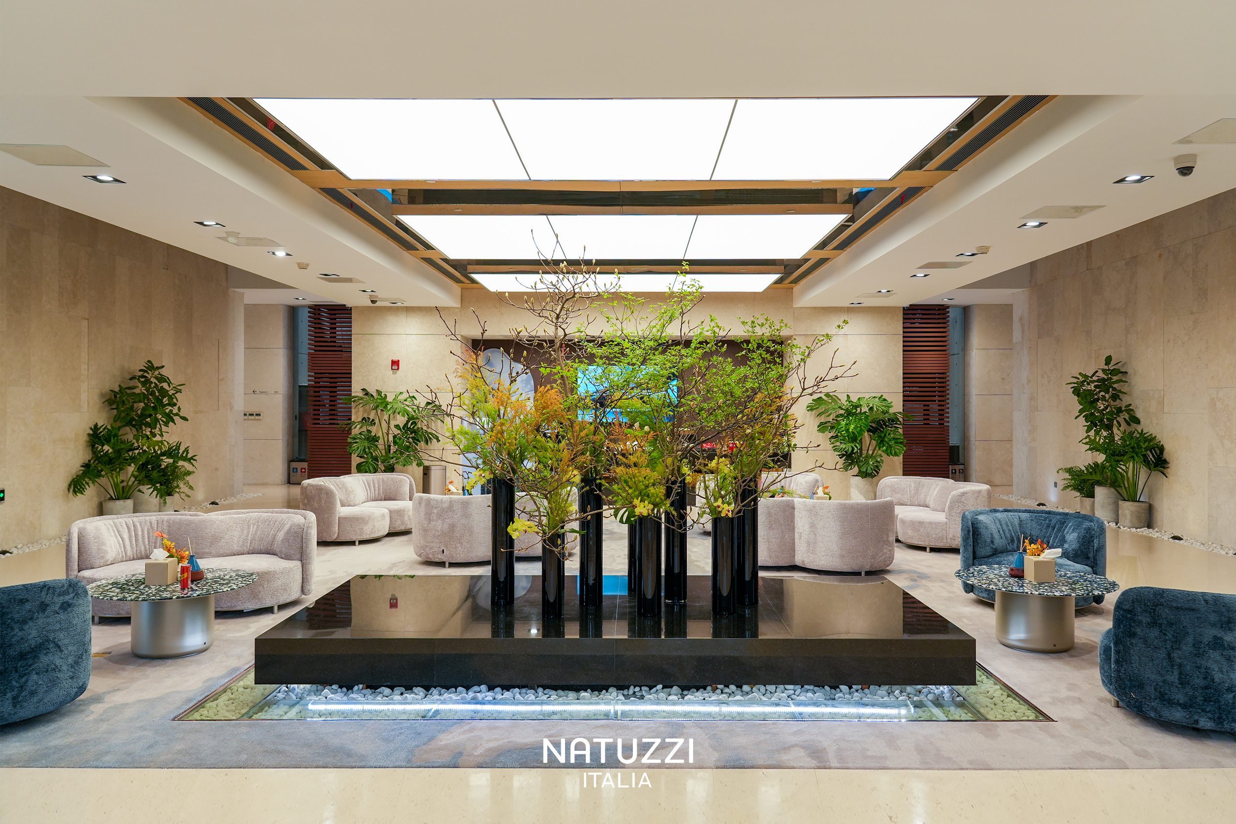 在航站楼中央大厅的中轴区域,Natuzzi Italia 通过巧妙的空间布局,将自然元素与现代设计完美融合。富有曲线感的花植与亮黑色石质器皿相得益彰,与浅褐岩纹墙面、悬顶的透光带共同构筑出简约而不失大气的空间基调。点缀其中的棕榈阔叶灌木,与Wave沙发流畅的海岸线廓形、Voyage茶几折射的璀璨星空纹理形成巧妙呼应。深邃蓝调与轻柔雾白