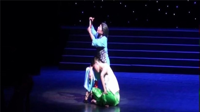 作品将唐诗《游子吟》“慈母手中线,游子身上衣”的意境具身化于舞台。夏冰以极简的人物与情节,营造出撼人的视觉张力:一根红线,牵起母子脐带般的联结。母亲为远行的儿子赶制鞋垫,针起线落,刚柔相生;儿子步履轻灵,天真烂漫,或捶背穿针,或嬉闹推搡,在与母亲的互动中唤醒观众共通的童年记忆。