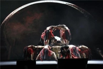 整部作品蕴藏着舞剧般的宏大叙事与精神张力。它以苗鼓为脉络,贯穿起苗族千年迁徙史中的战争、爱与希望:第一段鼓为战魂。鼓声乍起,如山雷滚动。一名男孩腾空而出,引领一群男子奋力前冲,展现出苗族历史上悲壮战争与迁徙图景。从上古至解放前七次大迁徙,贯穿山水间,每一步都是生存跋涉,每一程都是文化延续。第二段鼓为爱语。苗族是山巅民族,依山而生,傍水而存。在迁徙苦难中,仍有爱的生长。一段群女翩跹的双人舞,如清流般温柔浮现,河水滋养情愫,舞姿传递依恋——展现民族在颠沛流离中依然生生不息的人性之光。第三段鼓为新生。“看见太阳,就能活下去。”鼓声渐转昂扬,象征新时代召唤与民族解放。苗鼓不再只是战争的号角,更成为希望与重生的象征,舞步中洋溢从历史阴影走向光明的生命力。鼓皮不能丢——这是整部作品的精神内核。鼓声响刹那,整座花山在震颤。是苗祖血脉里奔涌的雷,是蚩尤战旗猎猎的响。鼓皮之上,是节奏与舞步;鼓皮之下,是民族记忆、祖先呼吸与文化根脉。夏冰以鼓为笔,勾勒一幅流动的苗族精神地图,每一记鼓点都砸在千年迁徙的脉络上——是先民踏碎夜郎月色的脚印,是勇士劈开武陵荆棘的刀光,是每个听见鼓声的人血脉中那簇越烧越旺的火焰。击响的不仅是声音,更是一个民族不灭的魂。