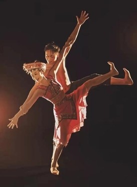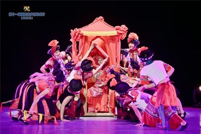 戏剧结构扎实,兼用喜剧手段——男生群舞的丑戏、矮子步、腾空跳、蛙跳以及脸上表情和形体的夸张表现,揭盖头、掀轿帘的逗趣,极尽渲染了幺妹花开幸福。当轿帘掀开,观众看到的不仅是哭嫁习俗的现代转译,更是一场文化基因的觉醒仪式。夏冰将“阳雀叫唤”歌谣转为欢快舞步,花轿颠簸化作生命律动。道具莲香运用灵巧,可作花梯、花房、打棍,为舞蹈注入蓬勃生机。作品通过诙谐生动的表现手法,展现爱情的热烈与智慧,国际评论称其“以微观视角折射宏大民族精神”。