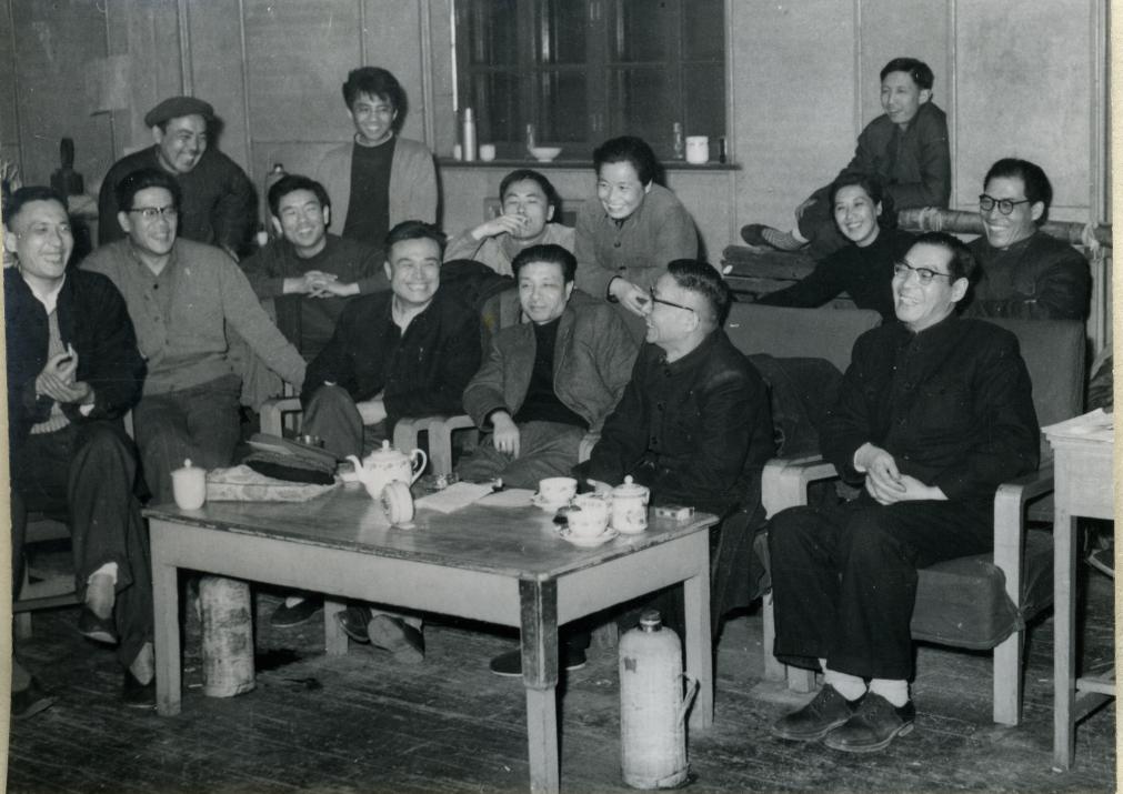 1963年4月,《茶馆》再次演出前,导演焦菊隐(前排右一)和编剧老舍(前排右二)与剧组成员在排练场聚谈。(北京人艺供图)