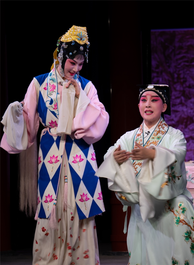 张媛媛与翁佳慧的“神仙搭档”,更是本次演出的一大亮点。二人合作多年,默契十足,总能精准拿捏角色的细腻情绪,将《玉簪记》的“清雅气”与“烟火气”平衡得恰到好处。饰演陈妙常的张媛媛,唱腔婉转空灵如月下清泉,完美契合道姑的脱俗气质;而饰演潘必正的翁佳慧,则以俊朗飘逸的身段、清亮醇厚的唱腔,勾勒出书生的痴情与风雅。无论是《琴挑》中二人的暧昧交锋,还是《偷诗》里的温情互动,他们都能凭借多年的合作默契,让情感自然流淌,让观众仿佛置身女贞观的月色下,亲眼见证这段跨越世俗的爱恋。