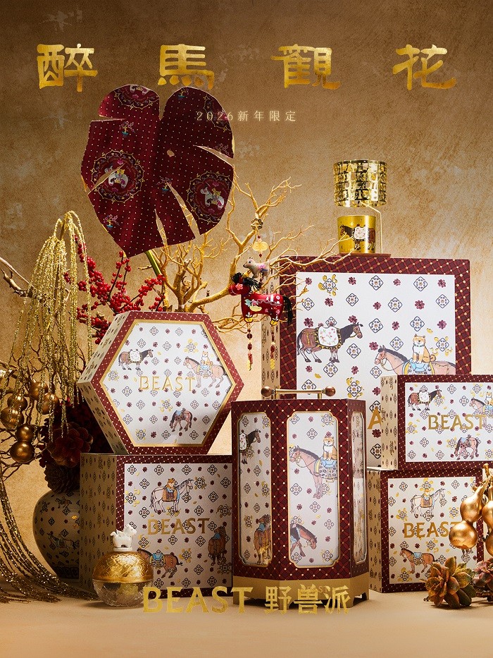 丙午马岁,一缕金香。野兽派以丙午马岁为引,发布 2026 马年限定主题「醉马观花」,以“果木金色”香气铺陈新岁气息——清甜先至、暖意随后,像年灯初上,金辉渐起,勾勒马踏新岁的喜福氛围:金光乍起,引福自来;循着一卷流动的海派剪纸画,走马月下,昭昭如愿——一灯悦心,一香安岁。系列同步上线多款居室香氛与年礼新品,以更完整的香事与器物组合,回应新春送礼与节日家居氛围需求。