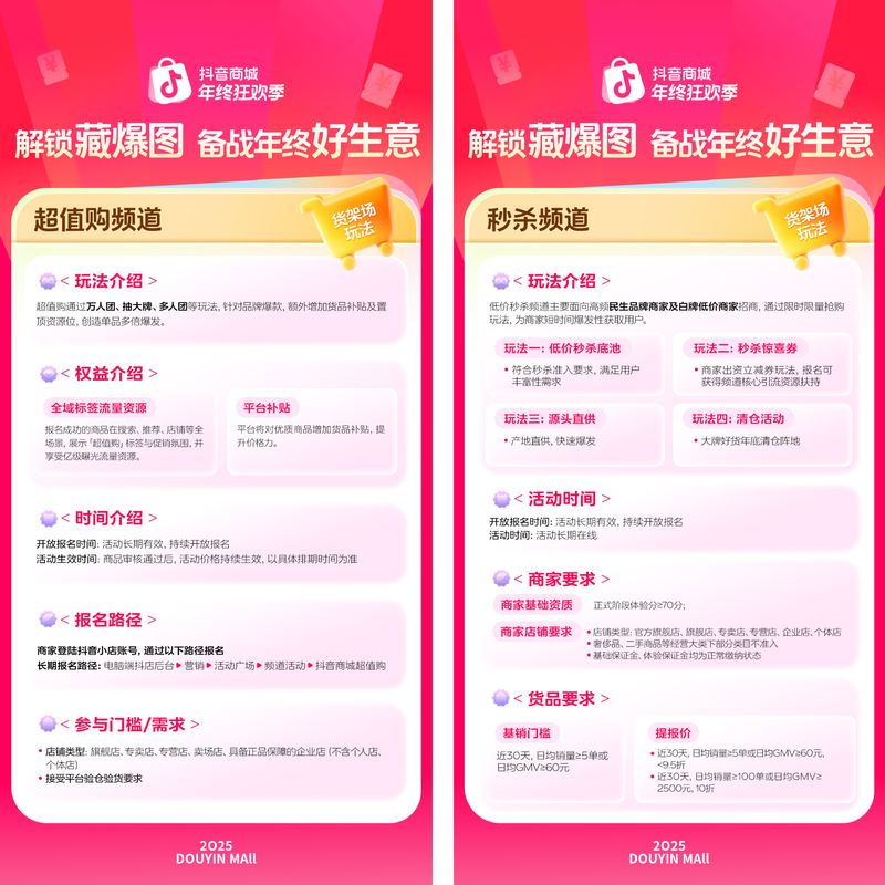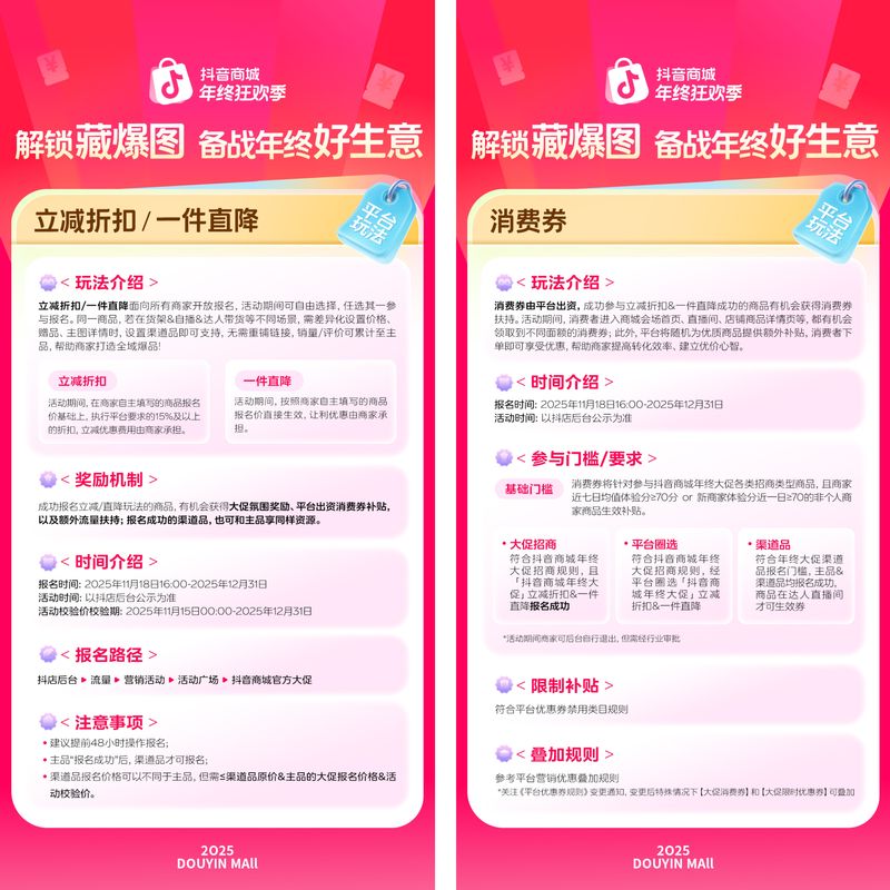 承接双11大促的强劲势头,「2025抖音商城年终狂欢季」招商正火热进行中,并于12月3日正式开启年终促活动。商家、达人可紧跟平台节奏,参与大促玩法,借力平台扶持,抢先布局蓄水,打赢全年收官之战。